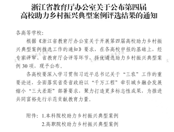 近日,10月21日,浙江省教育厅公布了《第四届高校助力乡村振兴典型案例》评选结果,通过高校自主申报及互评、专家评审、省教育厅会评等环节,择优遴出助力乡村振兴典型案例30项(本科院校15项、高职院校15项)。我校报送的《“四新”赋能,“育”见未来:义乌工商职业技术学院“电商育人”精准帮扶的创新实践与典型模式》案例成功入选。
