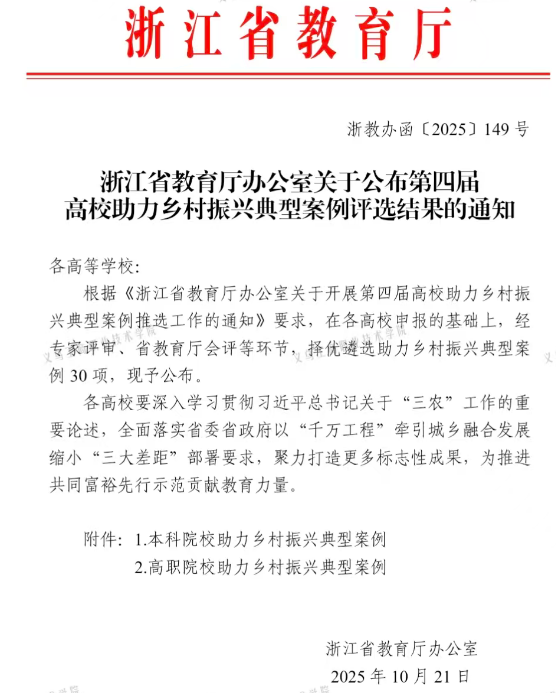 近日,10月21日,浙江省教育厅公布了《第四届高校助力乡村振兴典型案例》评选结果,通过高校自主申报及...
